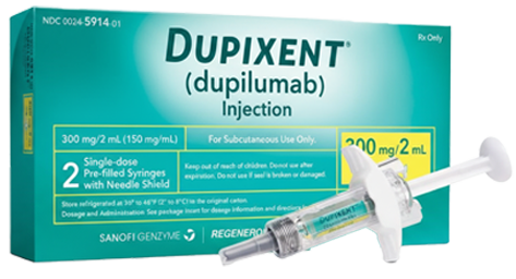 - Dupixent (dupilumab) is a biologic injection used for eczema, asthma, and related conditions. It works by suppressing immune pathways that control inflammation (IL-4 and IL-13).